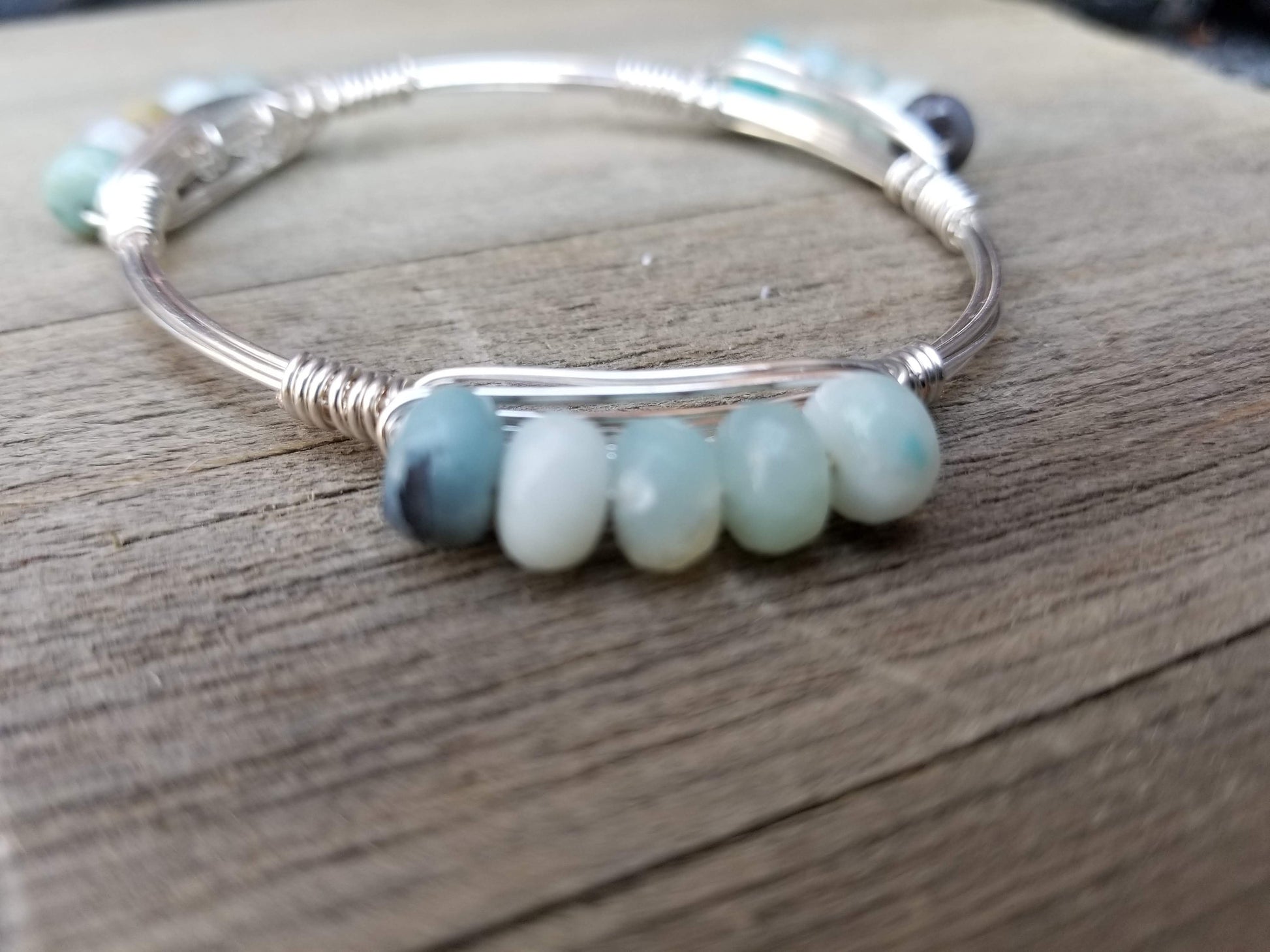 This amazonite abacus cluster bangle bracelet is beautiful. The blue and green bangle can be worn individually or stacked with other bracelets for a stylish look. It is handmade from wire and 8mm abacus beads added in 3 sets of clusters of 5 beads each. Each bead is slightly different and can range in color from blue to green to brown and white.