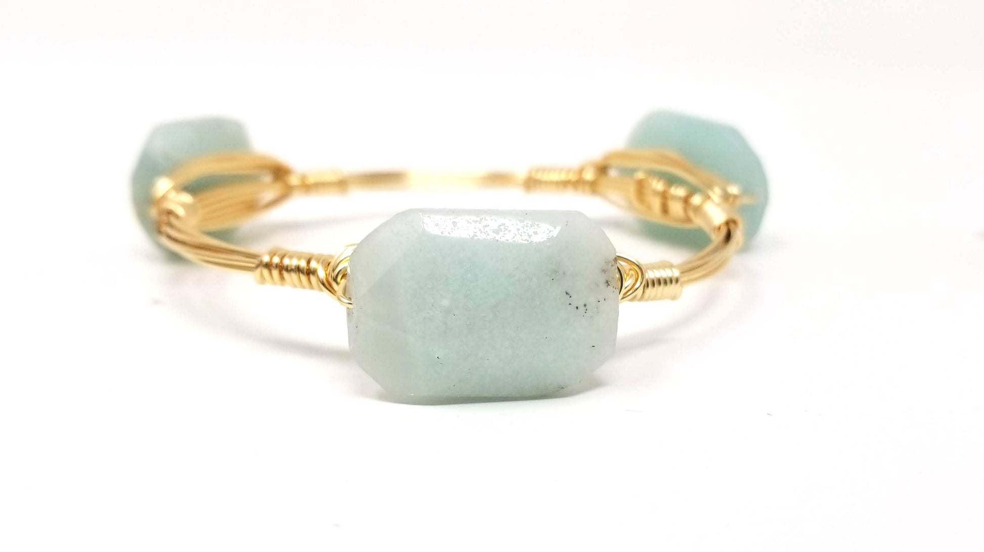 This set of 3 handmade wire wrapped bangle bracelets features a large amazonite bangle, an 8mm amazonite cluster bangle, and a fieldstone bracelet . These are true gemstones--no acrylic or plastic. Each gemstone will have its own unique characteristics. It will be similar to the one pictured, but not exactly the same. Choose wire color at check out.