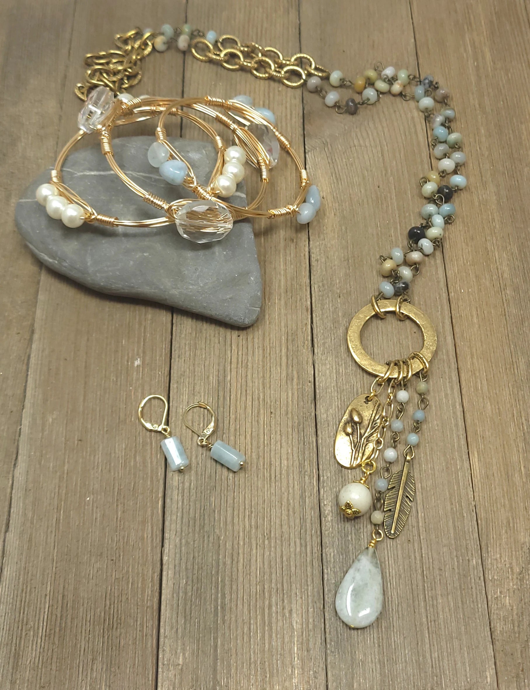 Aquamarine column beads hang from a lever back earring wire. Choose silver or gold.