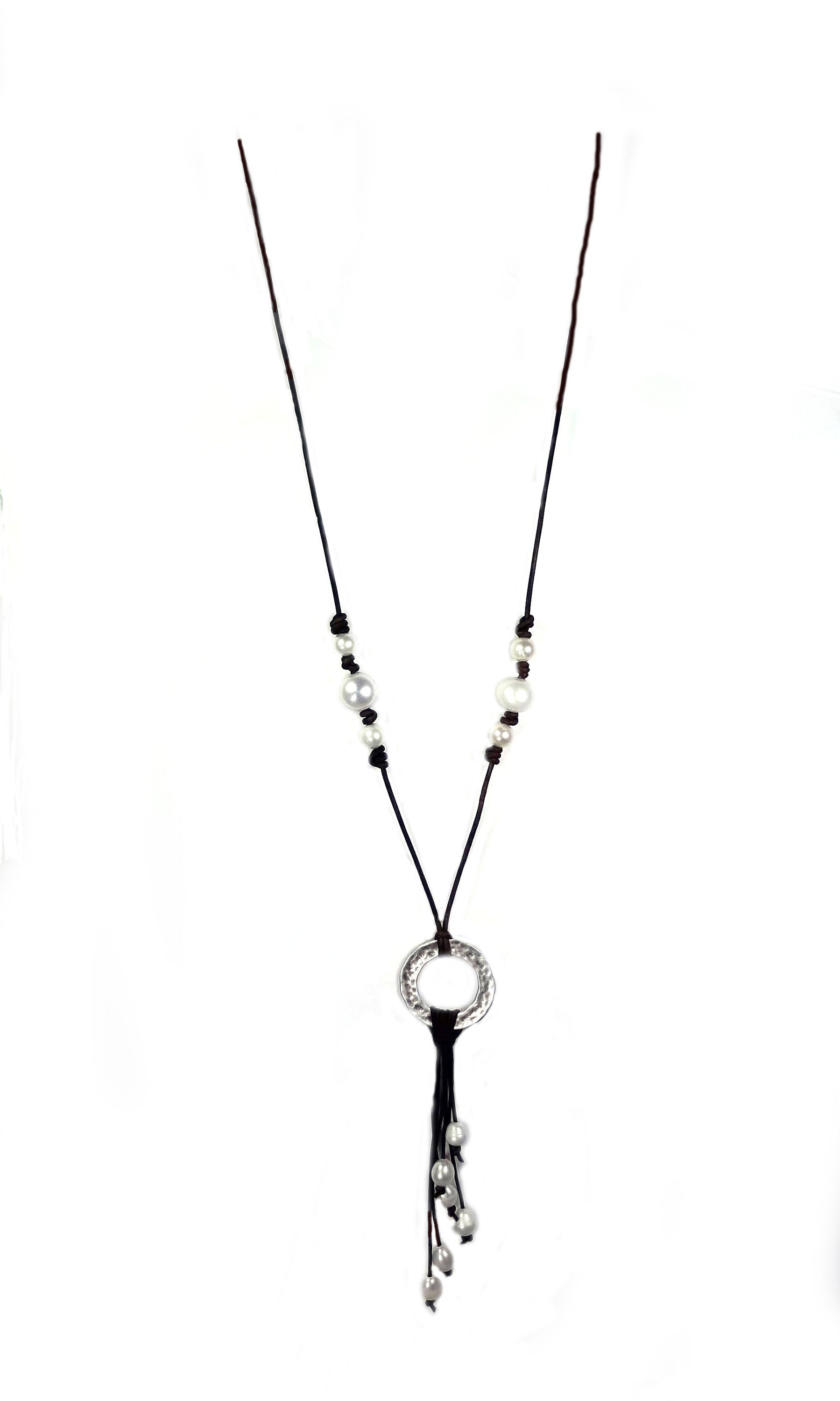 You will fall in love with this leather and pearl necklace with cascading pearls. The necklace is made with brown 2mm leather cording with pearls. A circular silver plated pendant is attached with cascading pearls. A sliding closure makes the necklace adjustable from 24 inches to 34 inches to the pendant. The cascading pearls are 6 inches long. So the necklace can range from 30 inches to 40 inches long. This necklace is a classic.