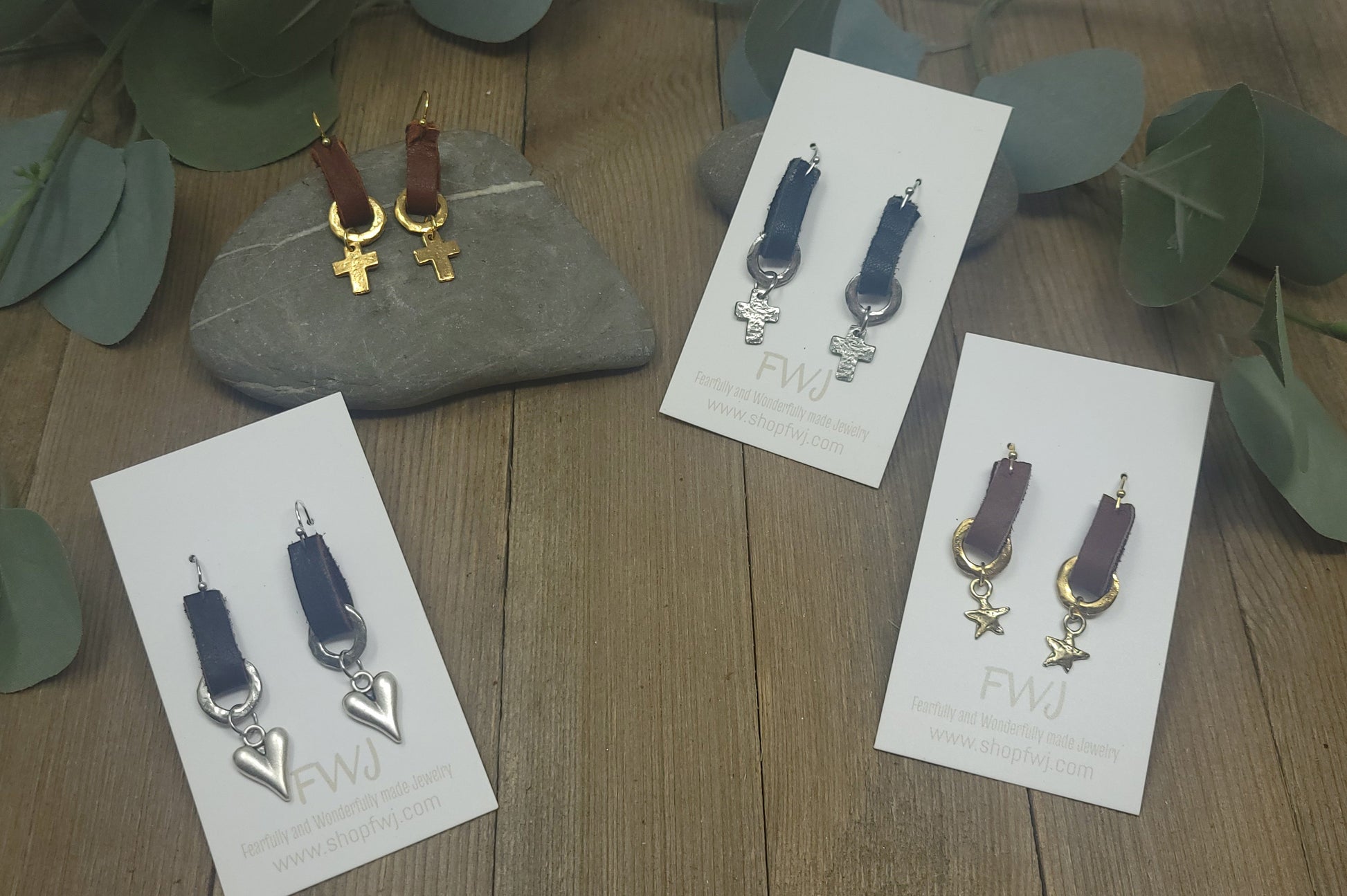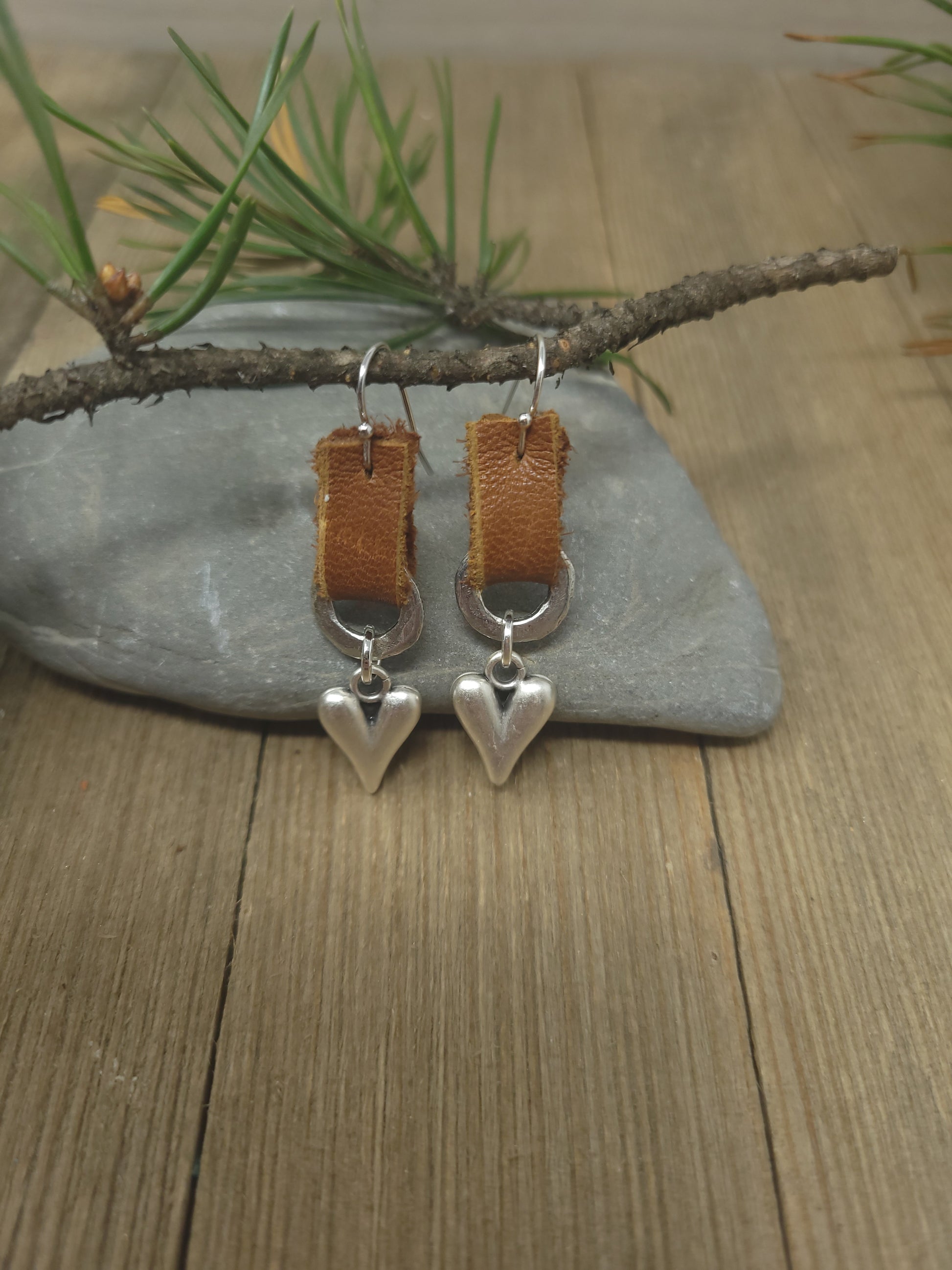 Leather and pewter earring with silver or gold heart or gold or silver cross